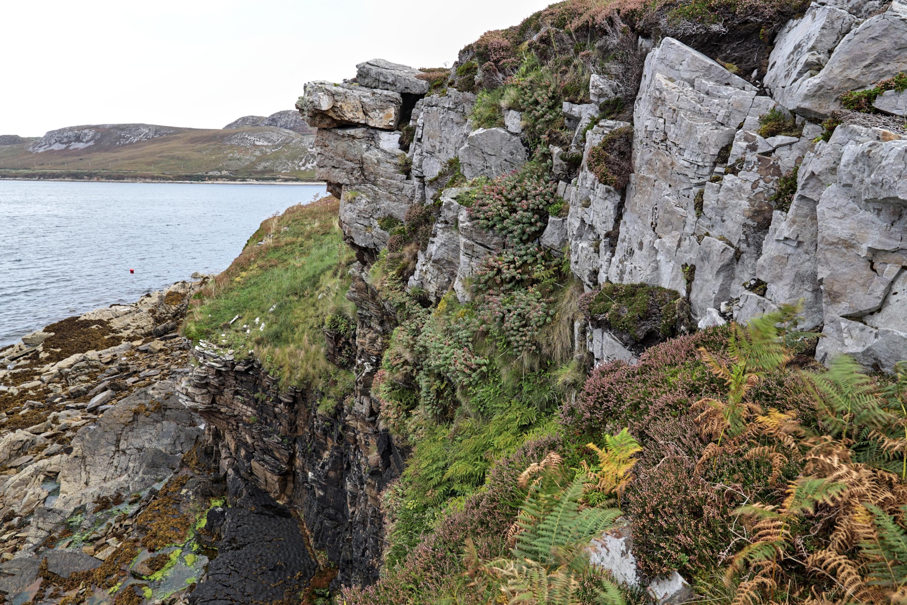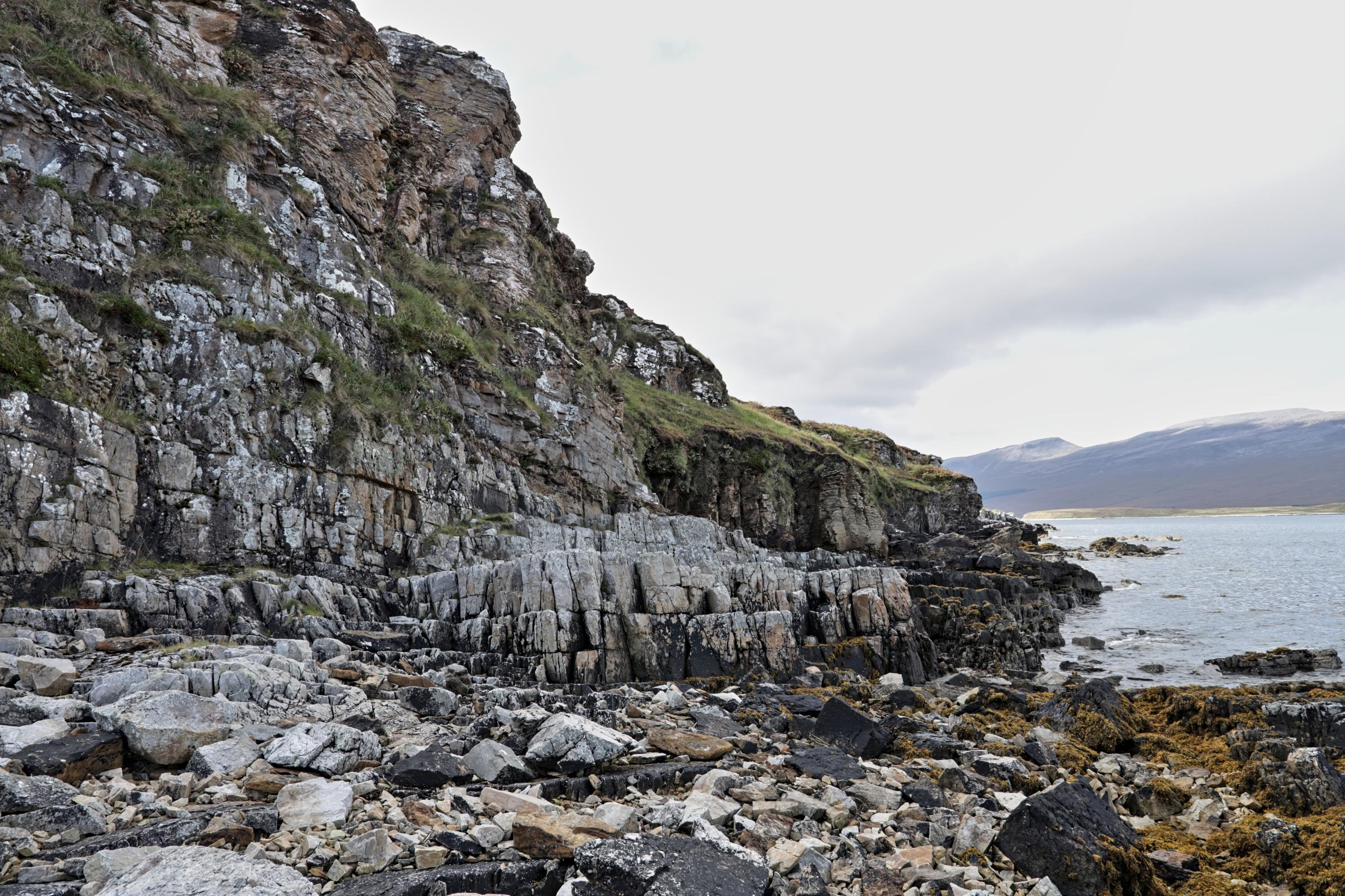 Thin dolomitic limestones of the Ghrudaidh Formation with a 40-degree southwest dip