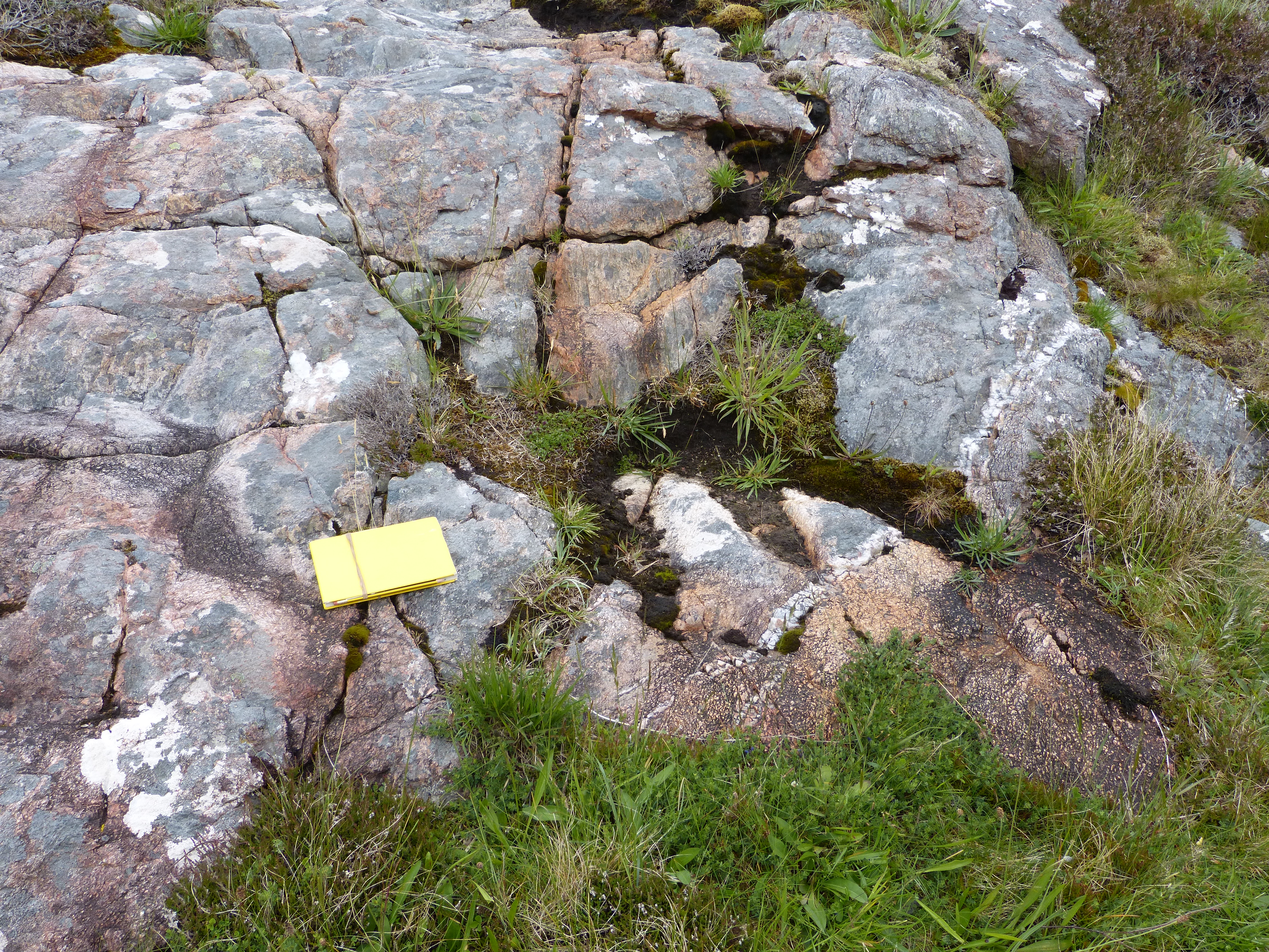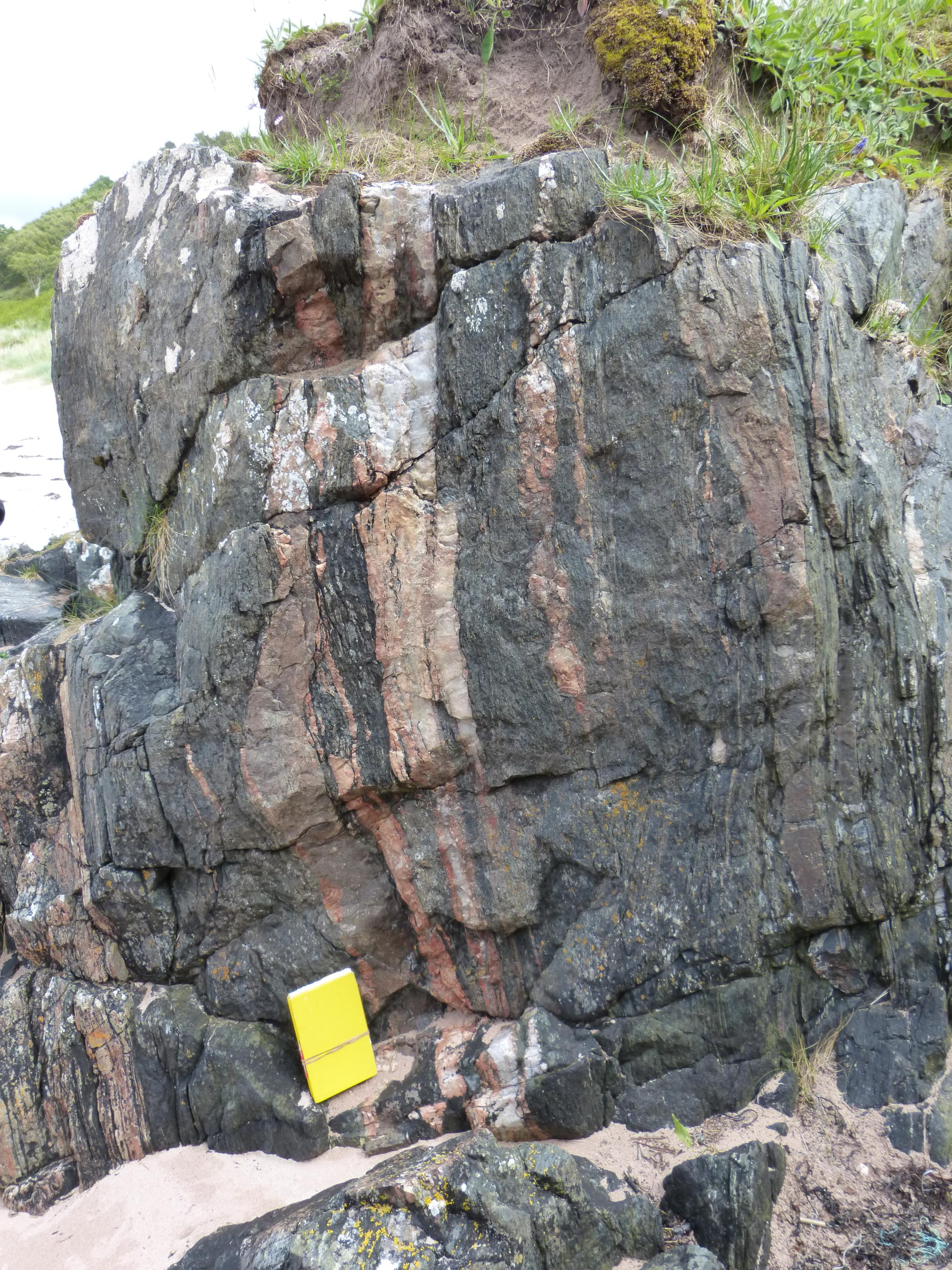 A close-up of the Ard Gneiss/amphibolite exposure shows highly irregular inclusions of pink micro-augen gneiss mixed with grey-weathering amphibolite, with veins of quartz cutting through both rocks.
