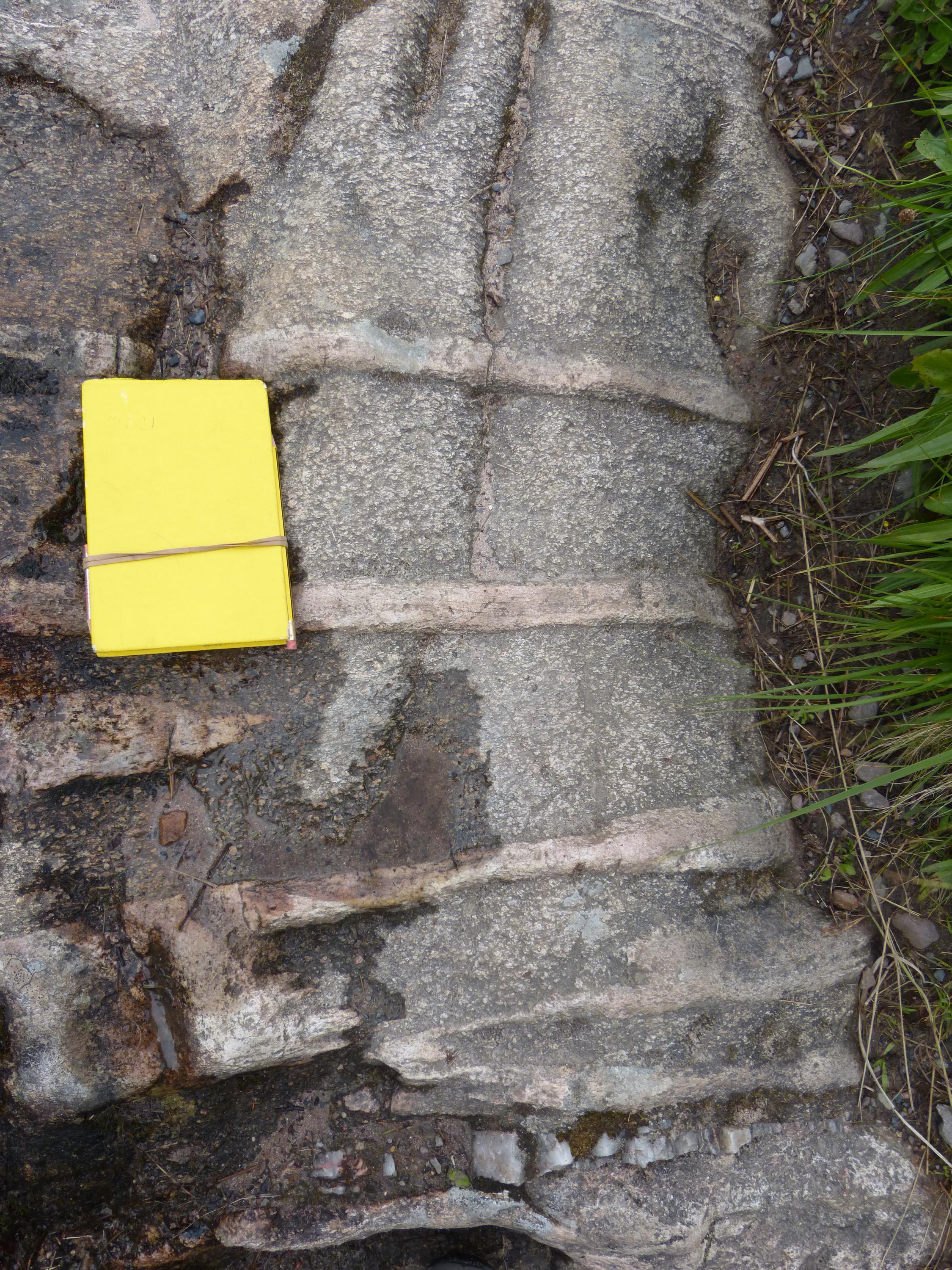Exposures of Ard Gneiss are seen in the footpath across the headland. There are frequent, roughly parallel quartz-feldspathic veins up to 10 cm wide, with occasional quartz veins, as seen in this exposure. The scale card is 15 cm long.