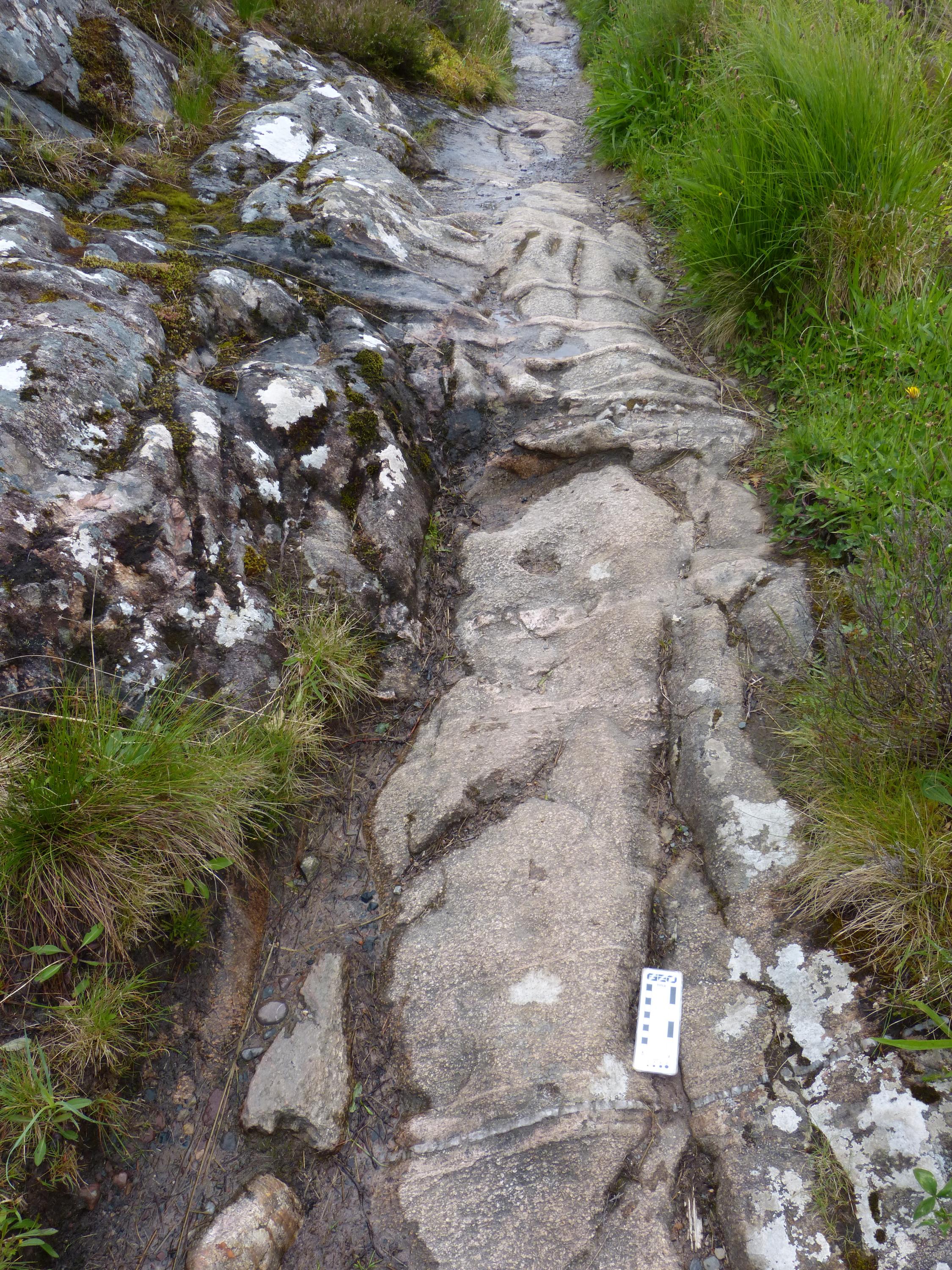 The footpath across An Ard crosses alternations of pale Ard Gneiss and dark amphibolite. Six metres of ice-scoured amphibolite are seen here; other exposures along the path show small-scale, intensely folded pale veins.