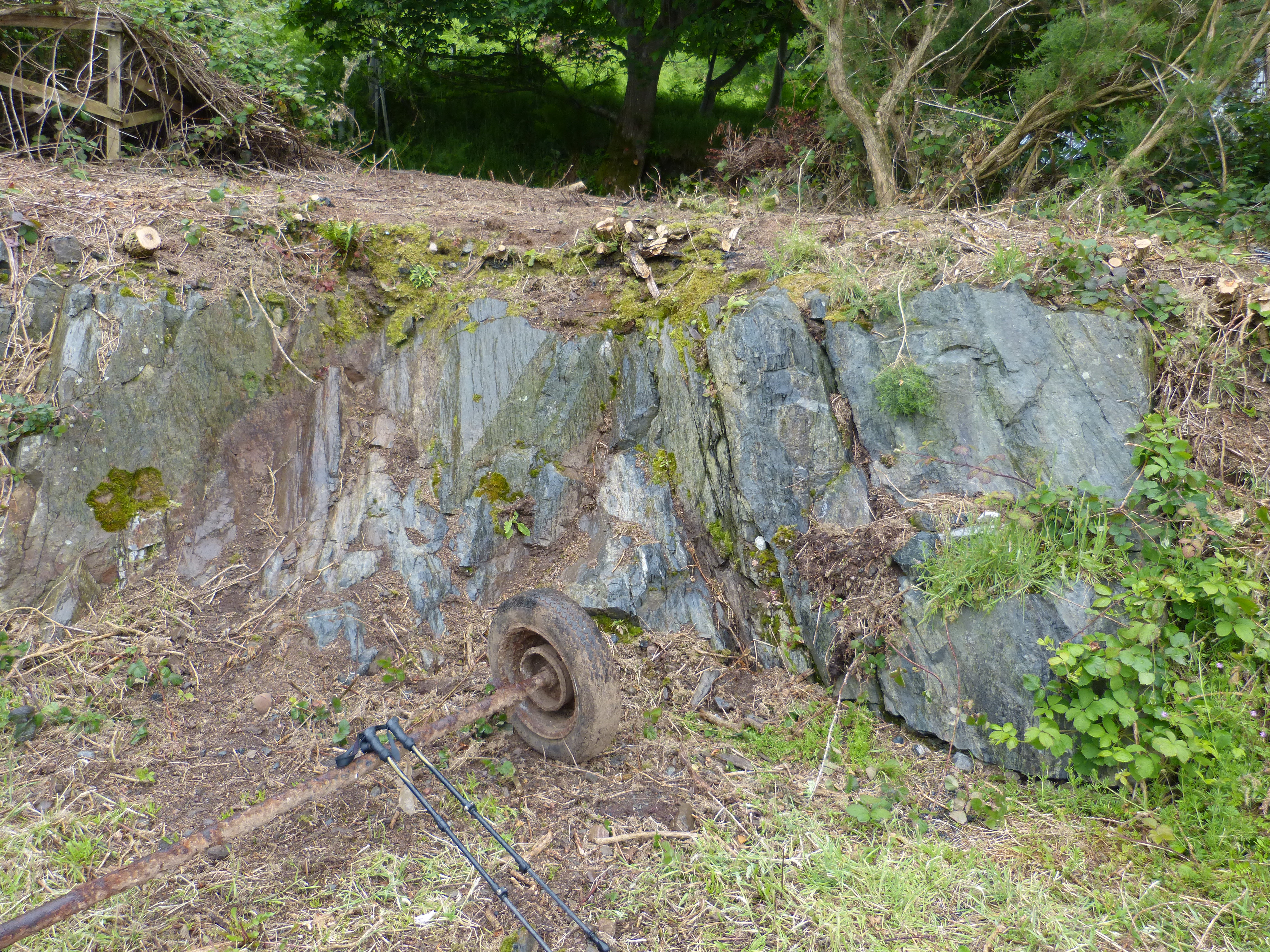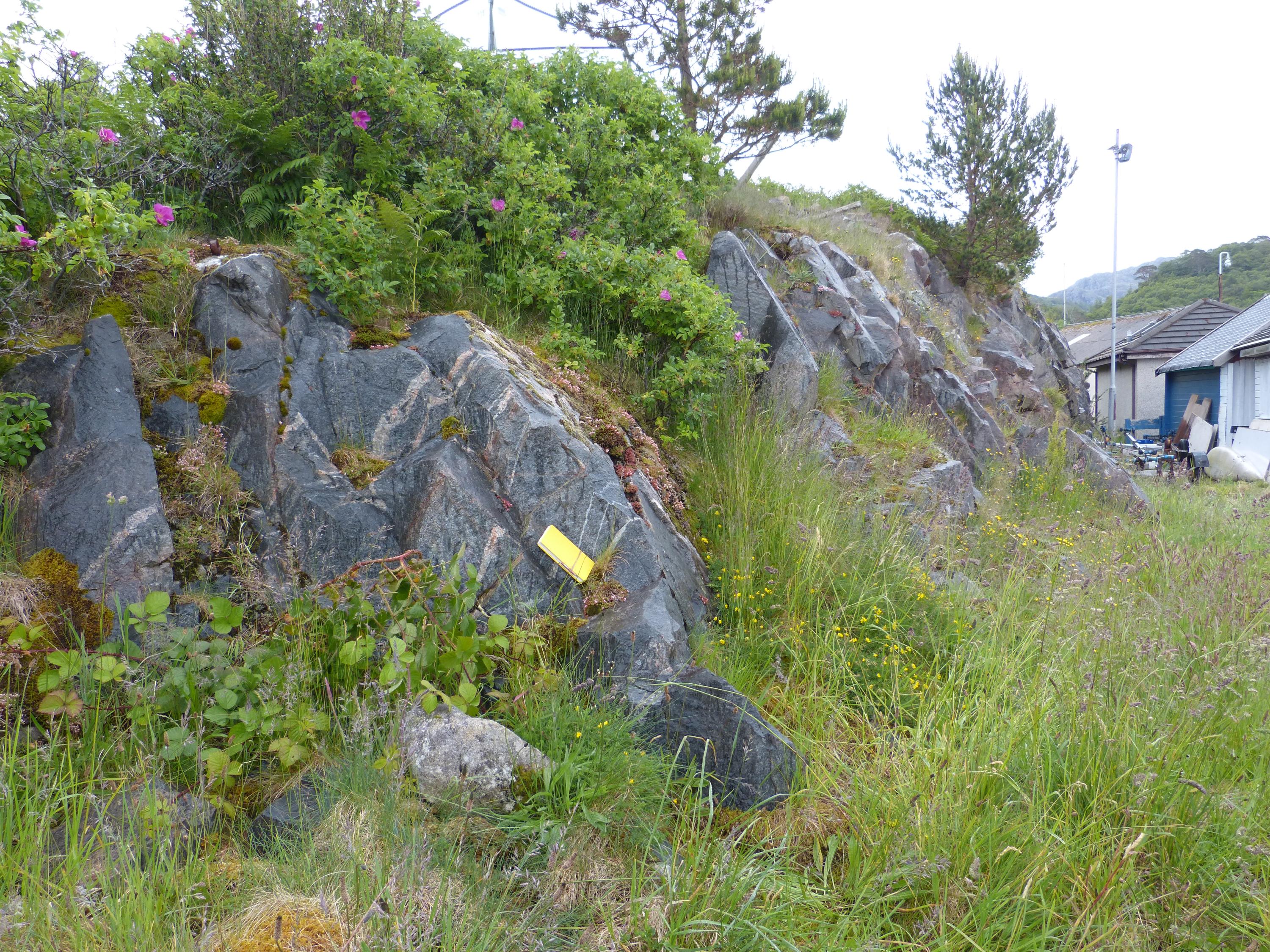 Between two buildings on the harbour road is an exposure of dark sub-vertical foliated rocks with extensive alteration to green minerals. The rocks appear to be highly altered metasediments, the semipelitic Charlestown Schists of the Loch Maree Group.