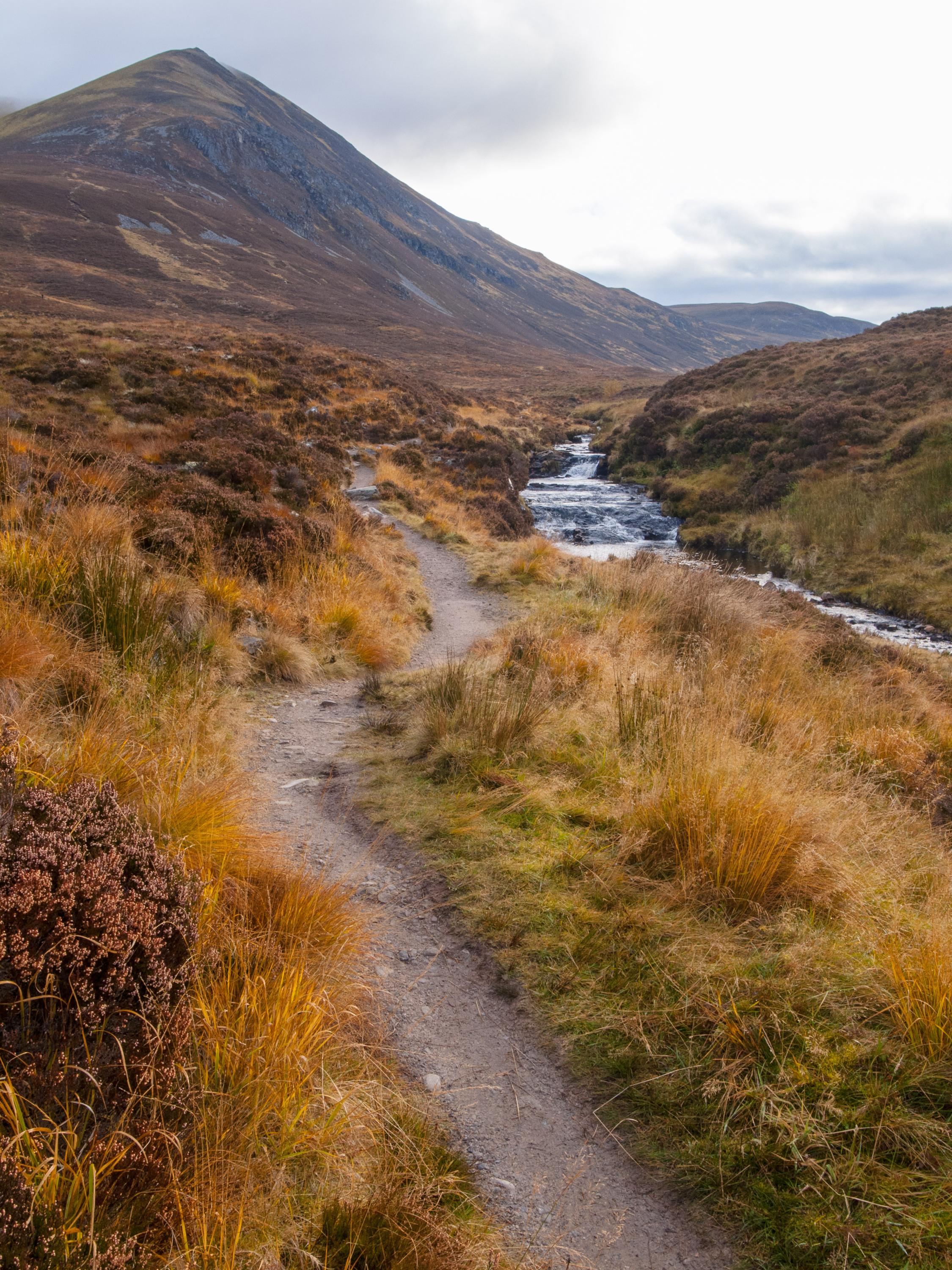 #4: the footpath beyond the eastern extend of the forest, with the steep flank of An Cabar (946m) to the upper left of the image, up which the path can be seen climbing. An Cabar is located at the south western limit of the Ben Wyvis ridge.