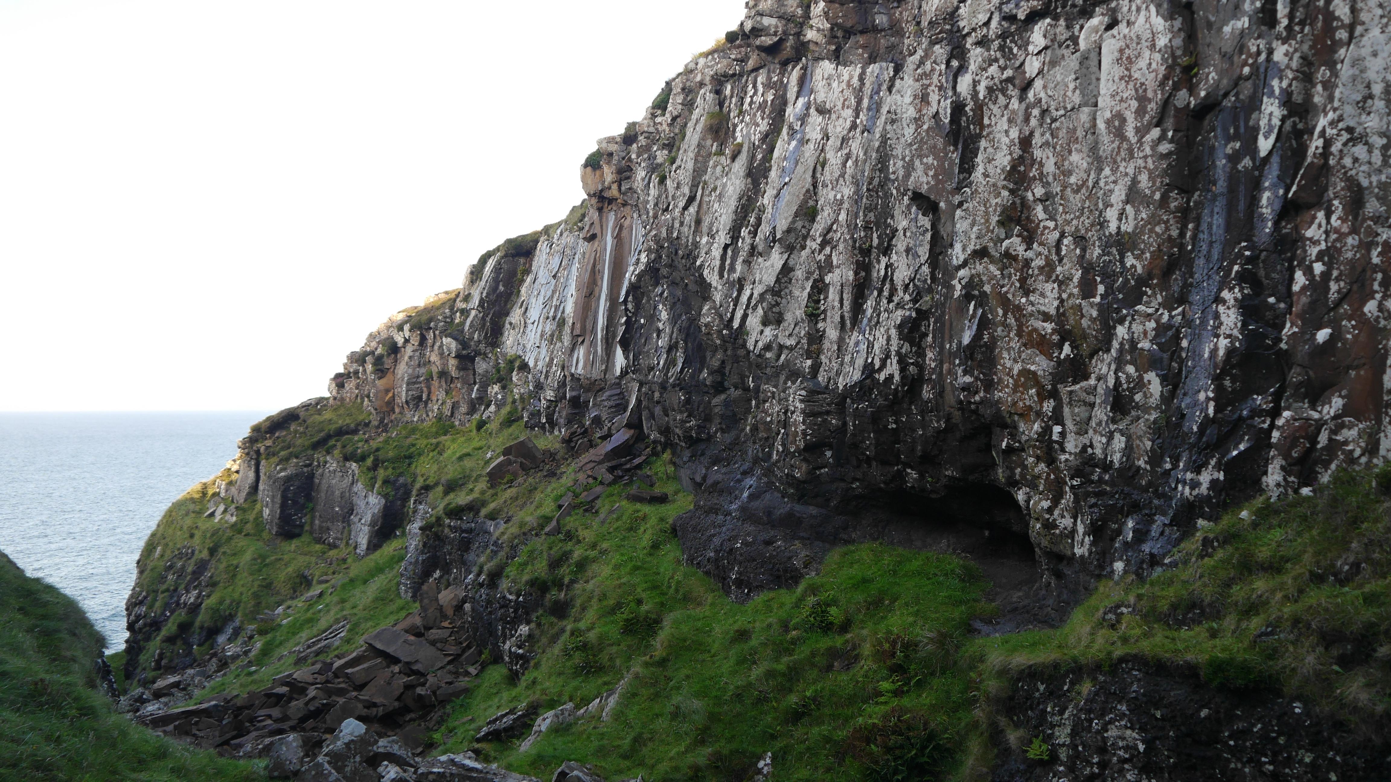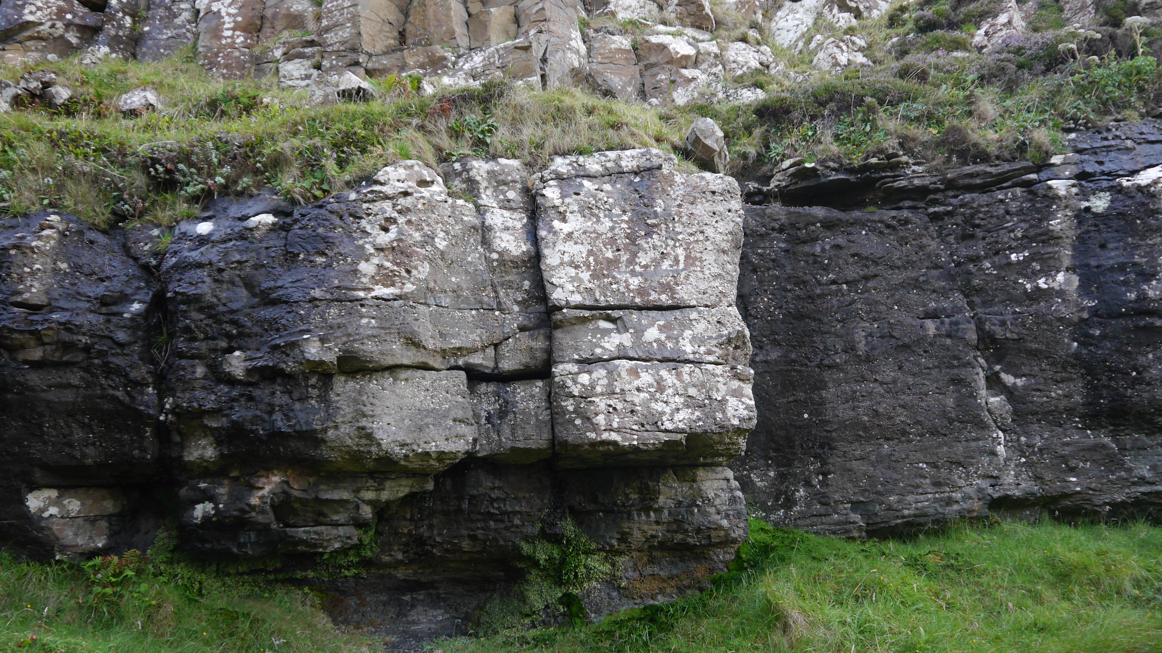 The top of the Ardtun Beds - sedimentary rocks deposited between episodes of volcanic activity on Mull. One of the lacustrine shale horizons can be seen at the bottom of the photograph (weathered inwards). This is followed a by c. 2 m of conglomerate, and the columnar-jointed olivine basalt (Staffa Lava Formation) on top represents resumed volcanic activity.