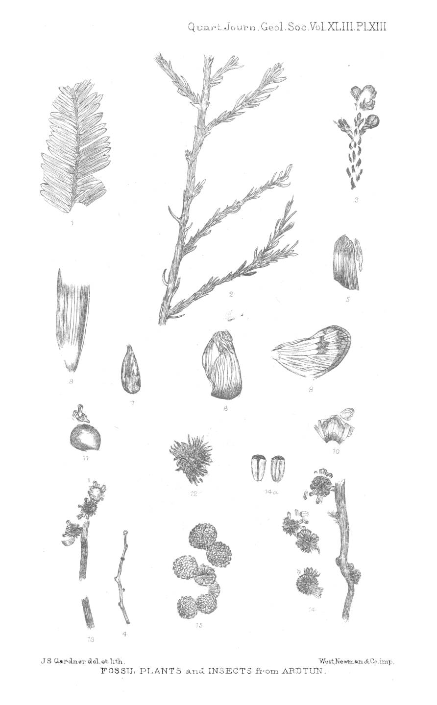 Sketches of fossil plants and insects from Ardtun Leaf Beds, in Gardner's paper (see link below).