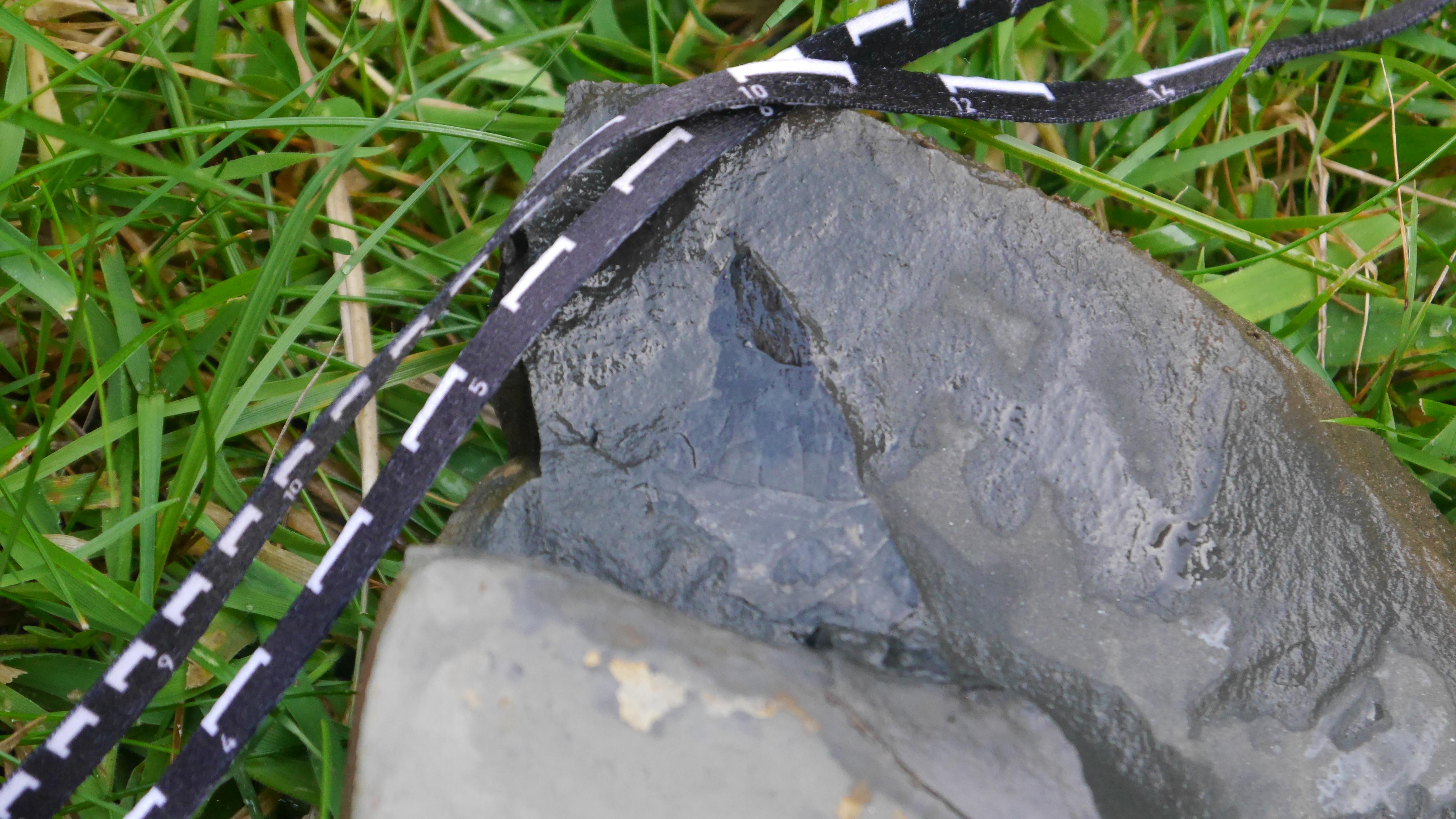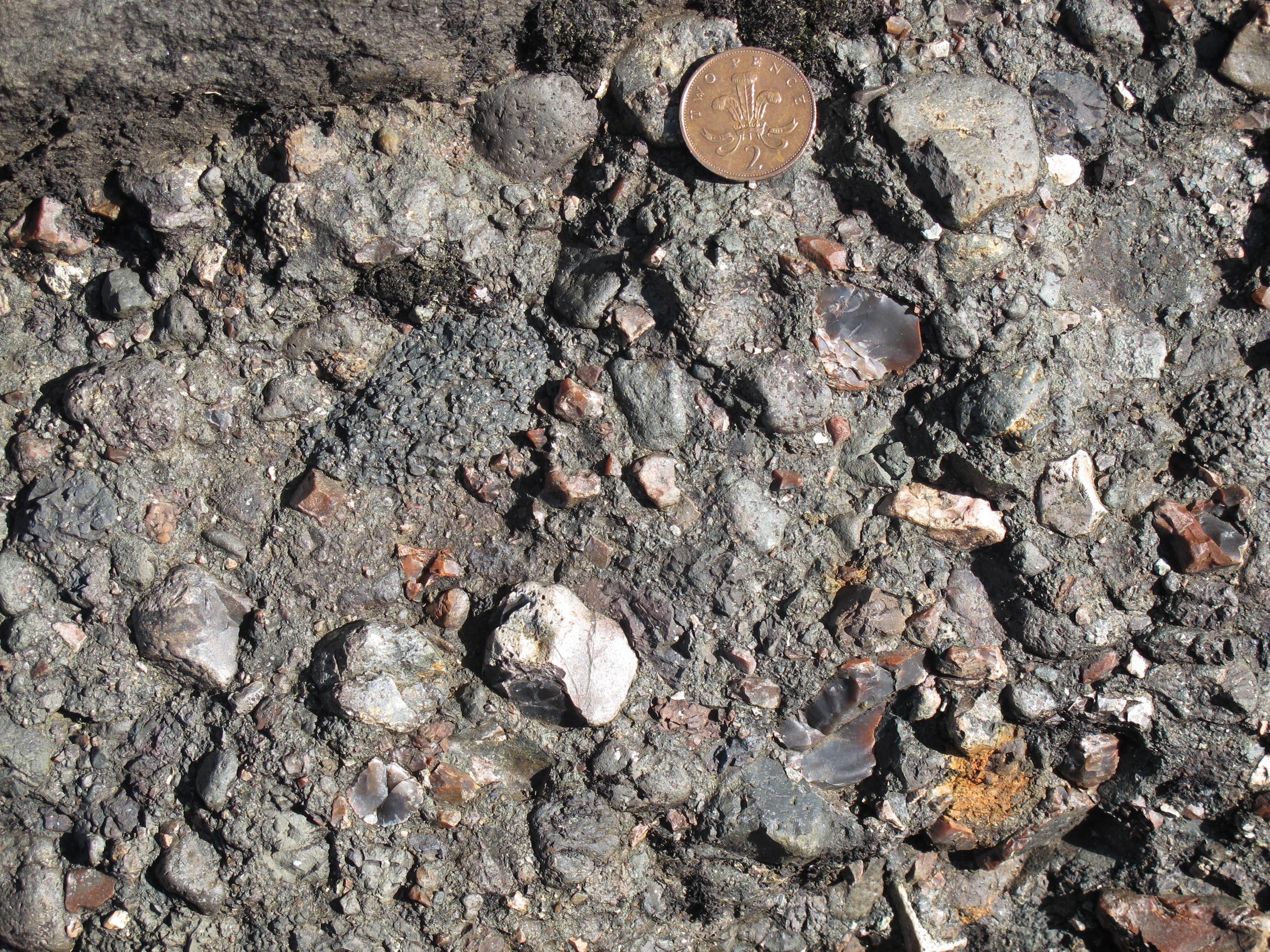 Detail of the conglomerate, containing clasts of Cretaceous chalk and flint.