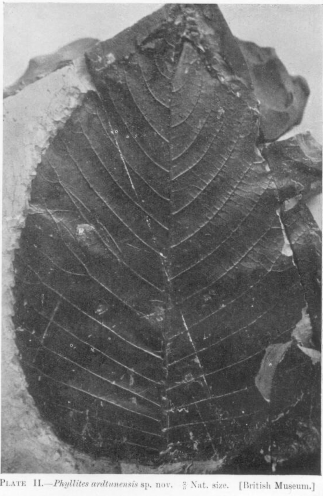 Photograph of leaf (Phyllites ardtunensis) from Ardtun, featured in the BGS Pre-Tertiary Memoir, edited by E.B. Bailey, 1924. There is a whole chapter on palaebotany: Seward, A. C. and Holttum, R. E., 1924. Tertiary plants from Mull. In: E.B. Bailey, C.T. Clough, W.B. Wright, J.E. Richey & G.V. Wilson, The Tertiary and Post-Tertiary Geology of Mull, Loch Aline and Oban. Mem. Geol. Surv. Scotland, pages 67–90.