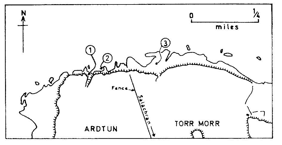 Sketch map of leaf beds excursion access route, from Skelhorn (1969) GA Guide to Mull (out of print). Locality 3 is shown in the overlapping igneous features at this site (see Ardtun Tertiary Igneous).