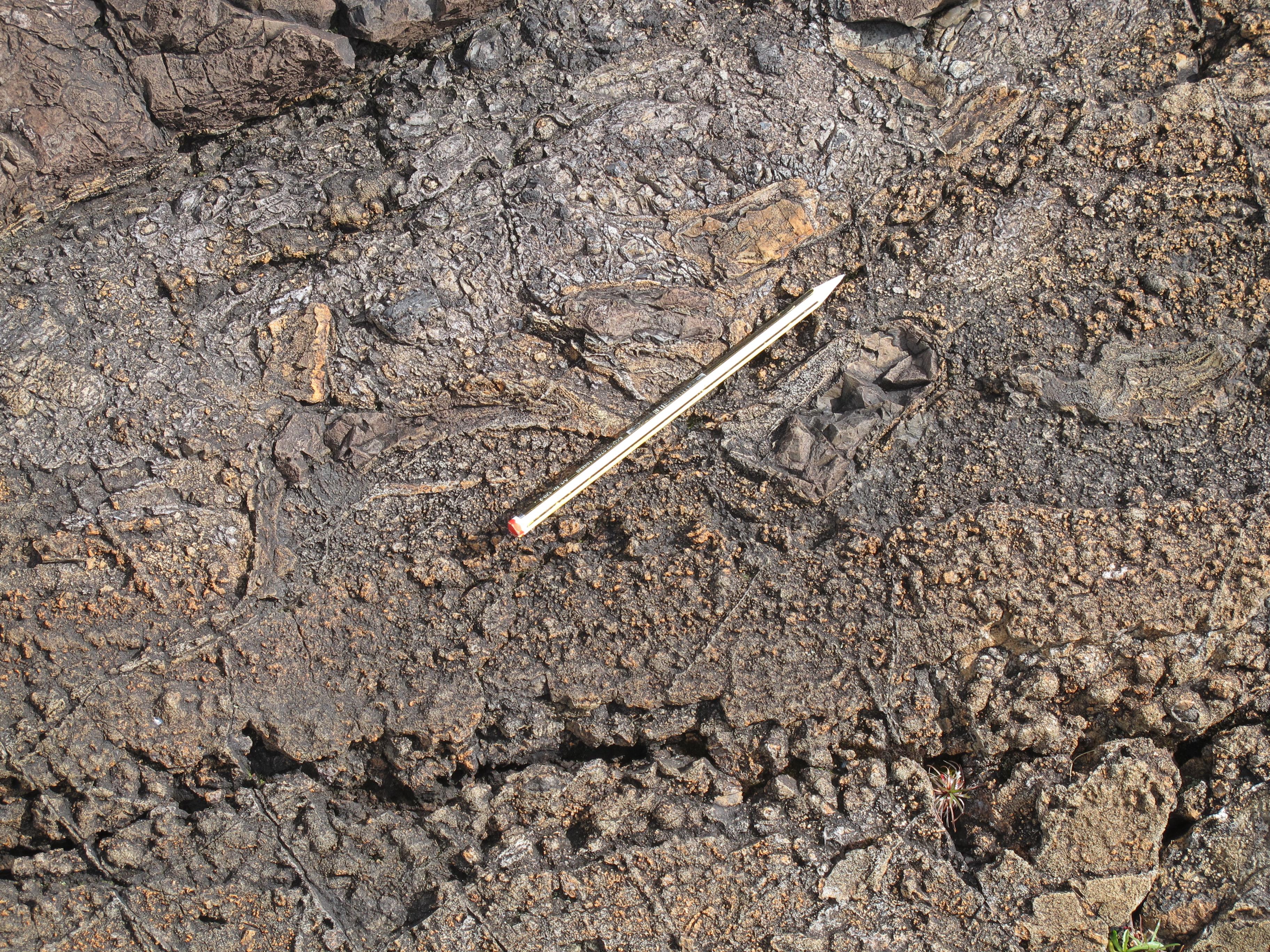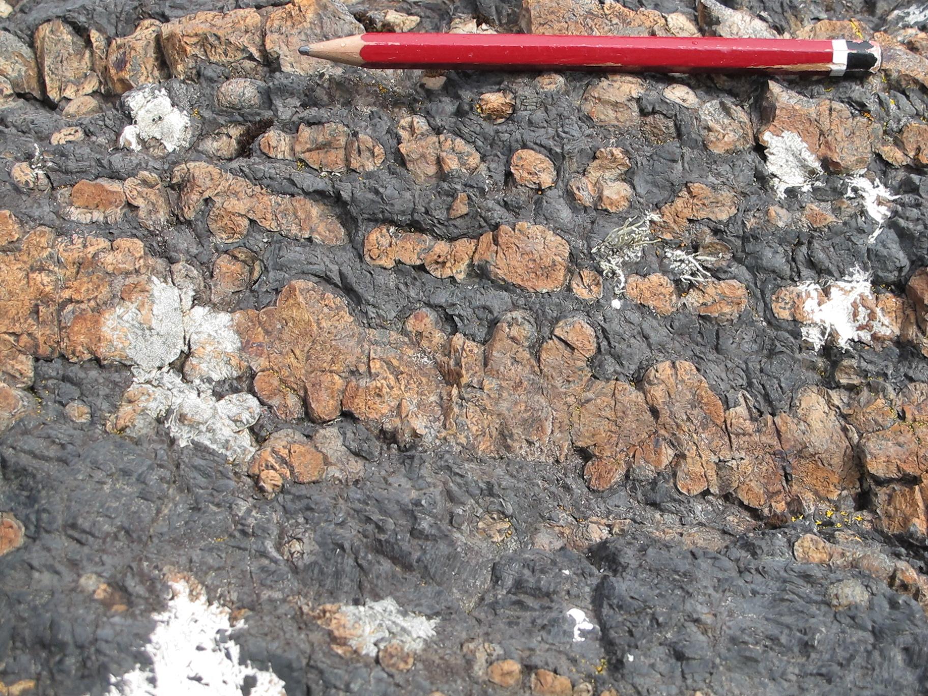 Varioles in altered edge / chilled margin of lava at contact with sill, Ardtun.