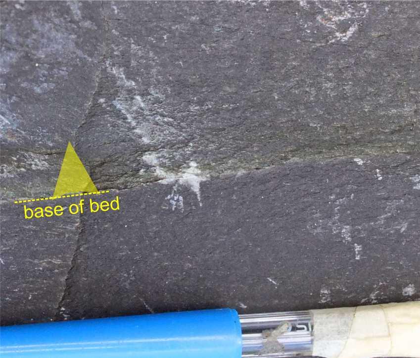 Graded silt bed (greenish, about 12mm thick) in a loose block of purple slate.
