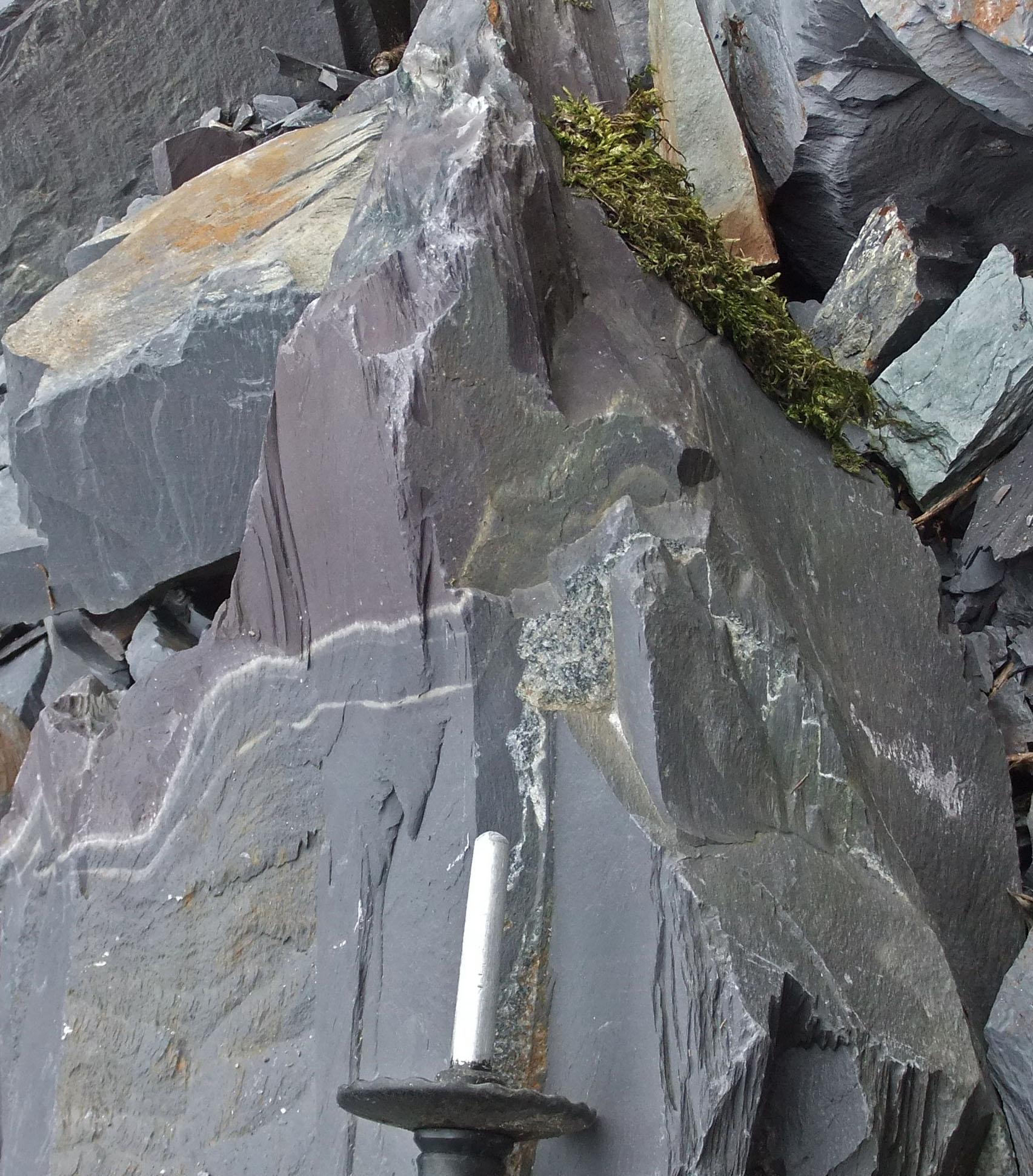 Small-scale folding in a loose block. Grey slate at the base, two thin white silt laminae, purplish slate at the top.