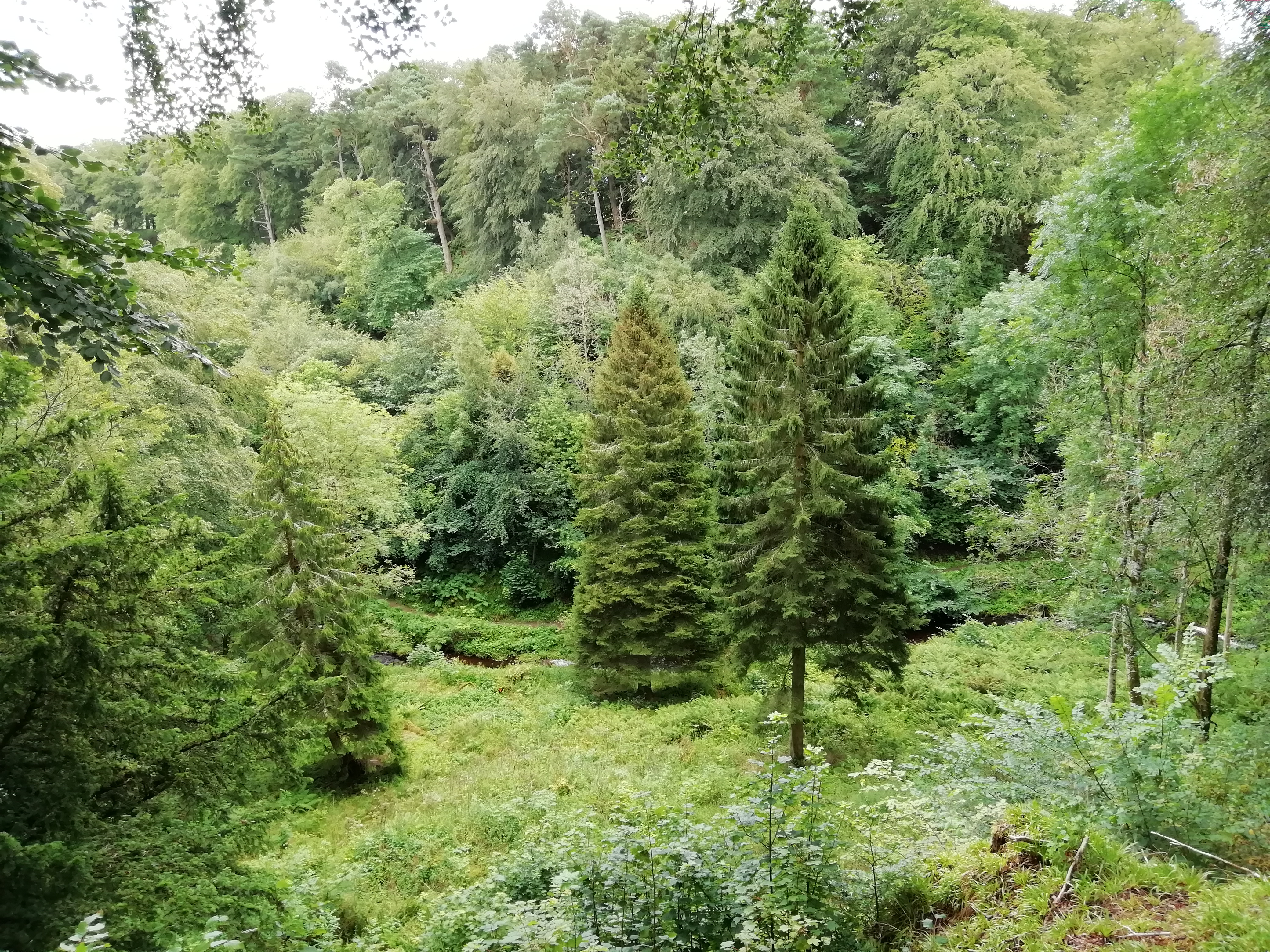 A delightful wooded valley with pleasant footpaths on the north side and along the River North Esk. Interesting features include a waterfall with plunge pool (Peggy’s Pool), views of a folly tower (Mary’s Bower) and Newhall House on the north side of the valley.