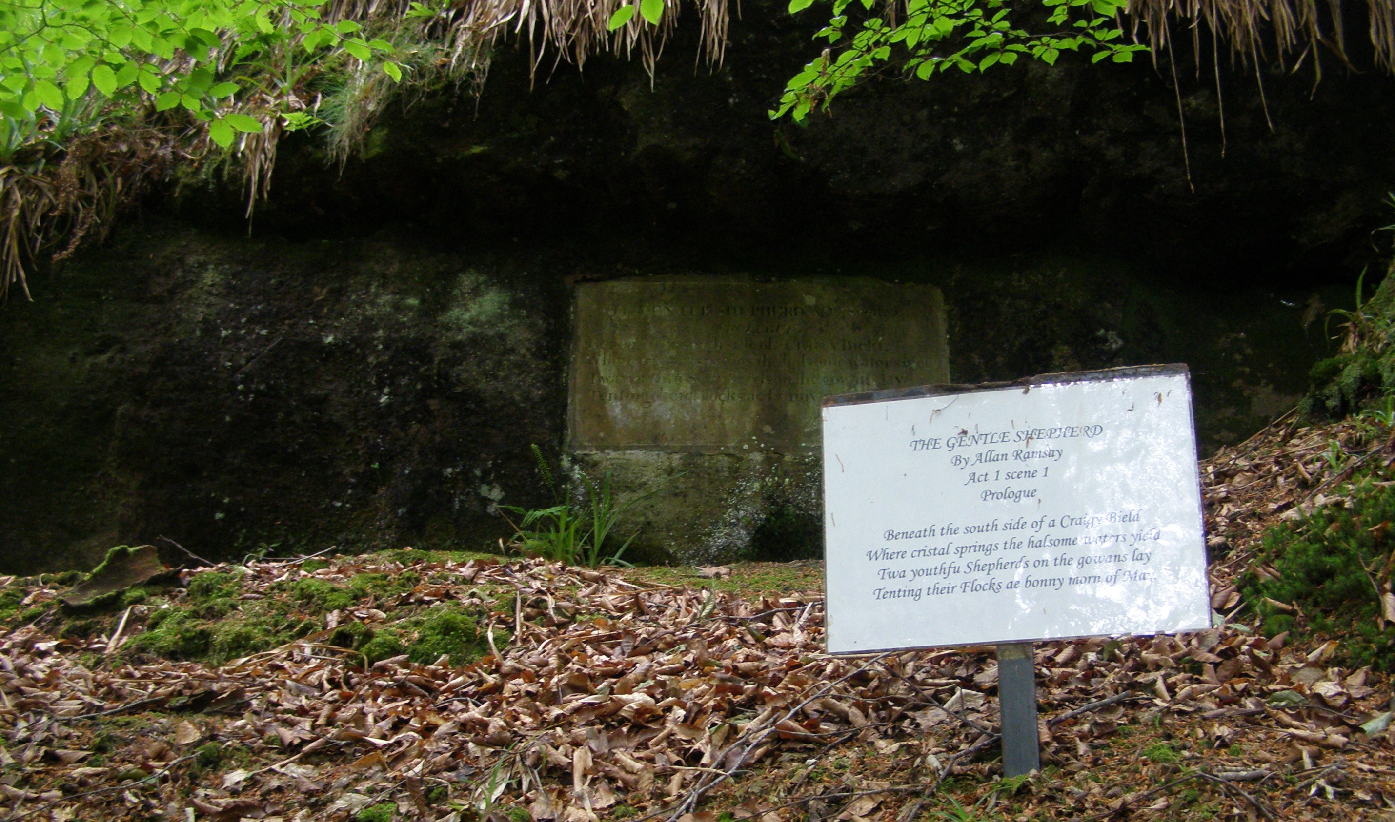 The plaque at Craigy Bield carved into sandstone in the downstream section of the valley is now much weathered. It quotes from ‘The Gentle Shepherd’, a pastoral comedy by Allan Ramsay published in 1725. The landscaping of Habbie’s Howe was undertaken during the late 18th century and remodelled in the early 19th century by the owner of the Newhall Estate, Robert Brown, as a setting for ‘The Gentle Shepherd’.
