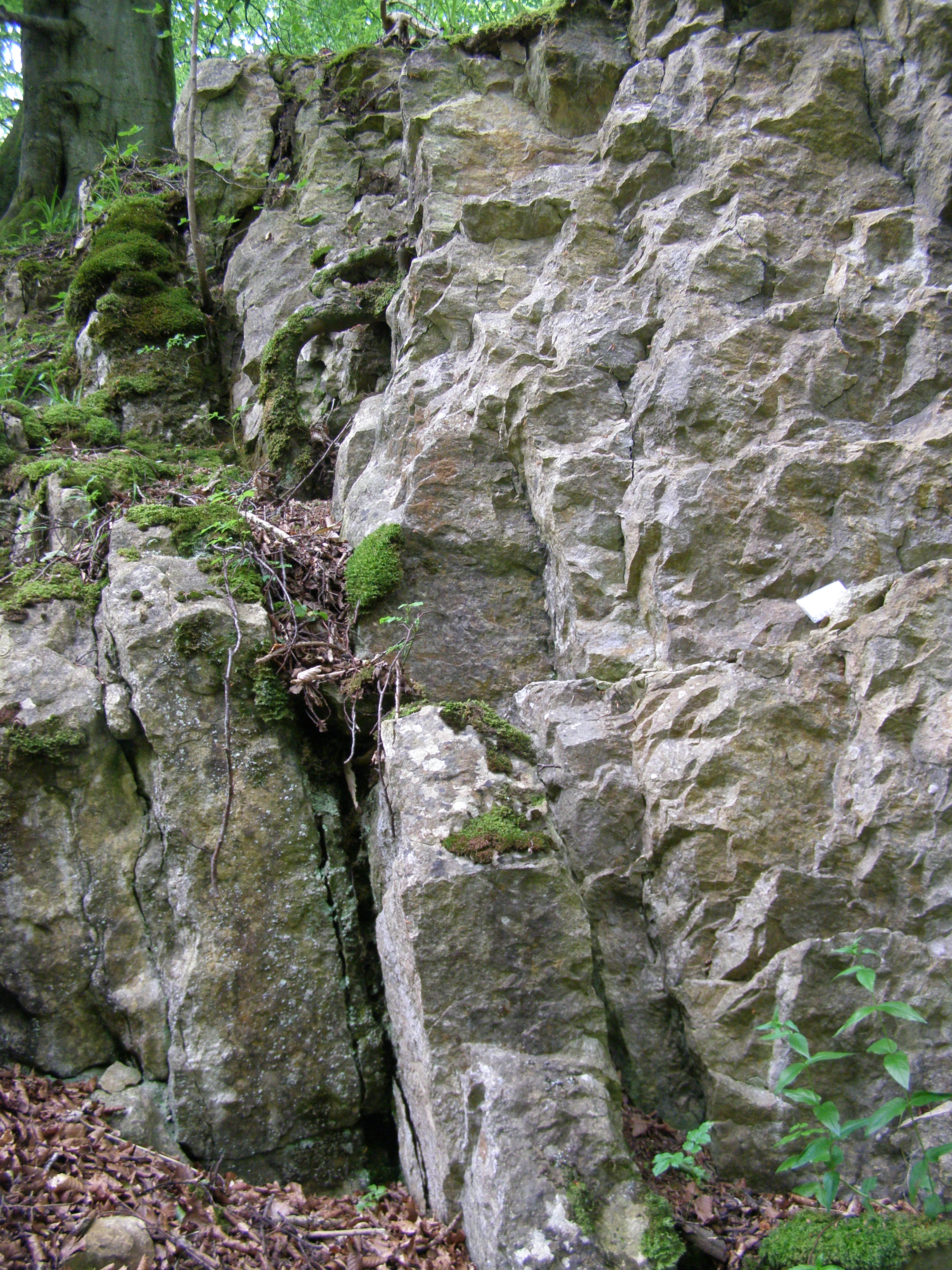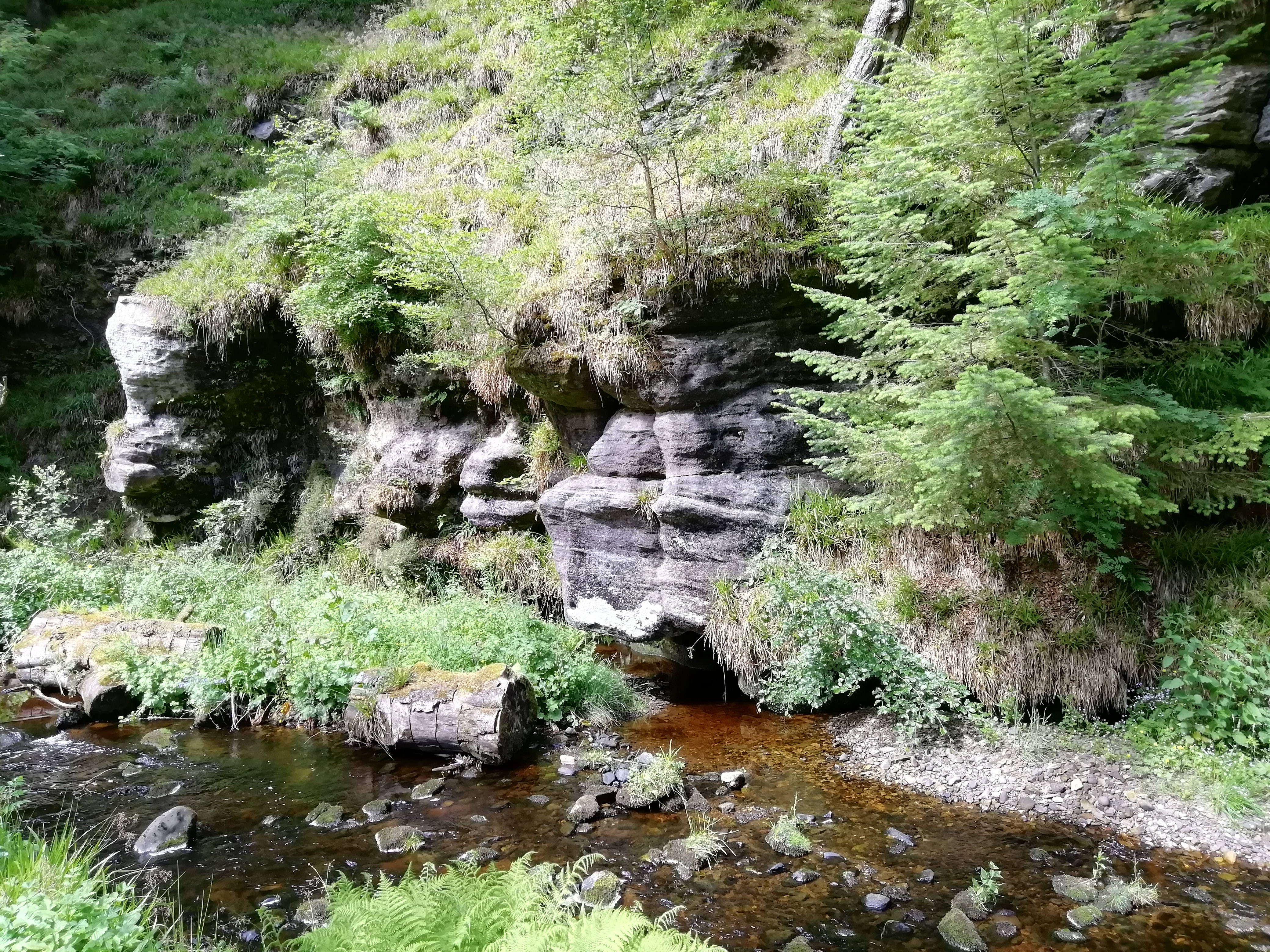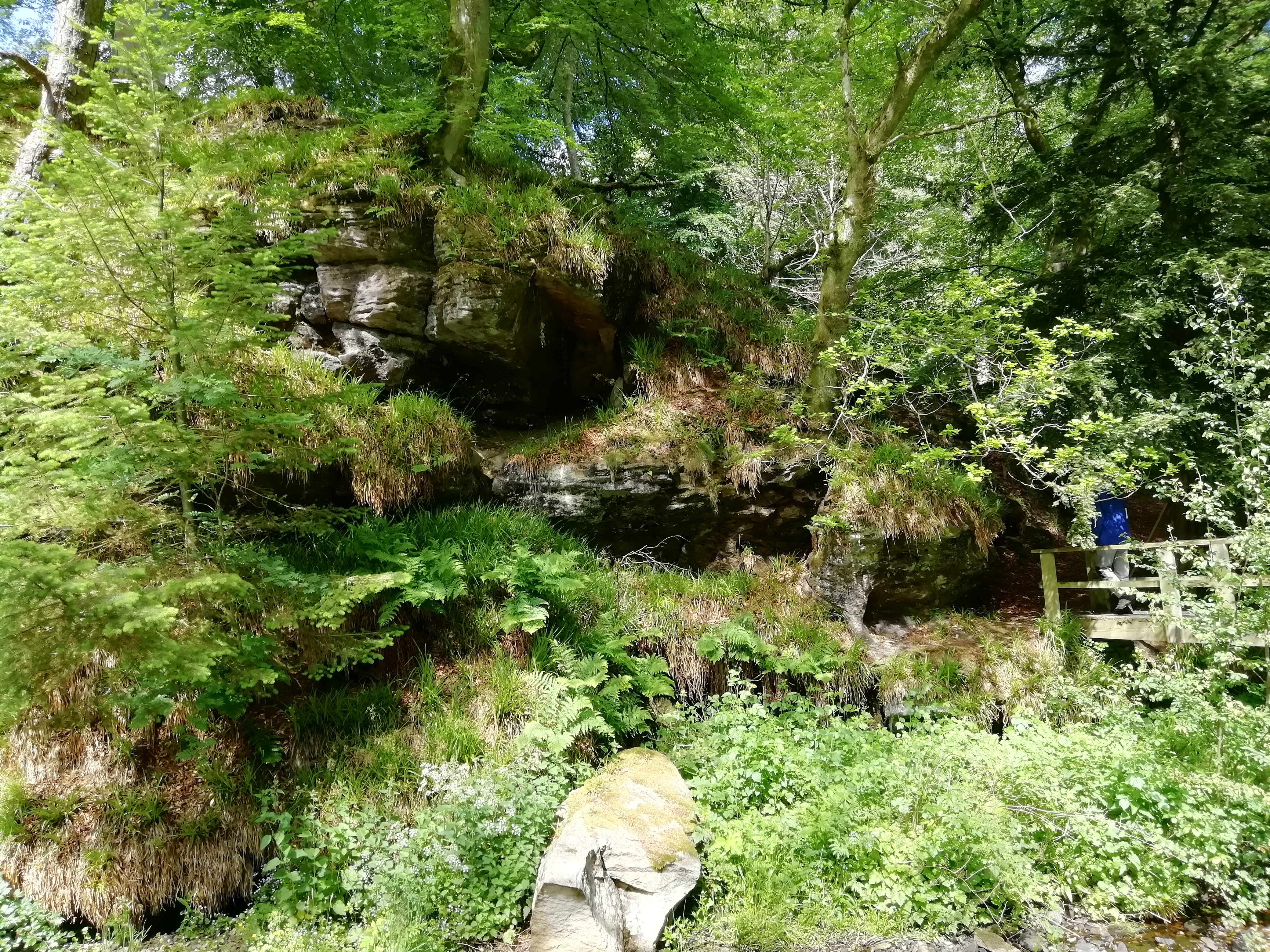 A wooded gorge about 1 km long with riverside cliffs of limestones, mudstones and sandstones as well as a small waterfall.