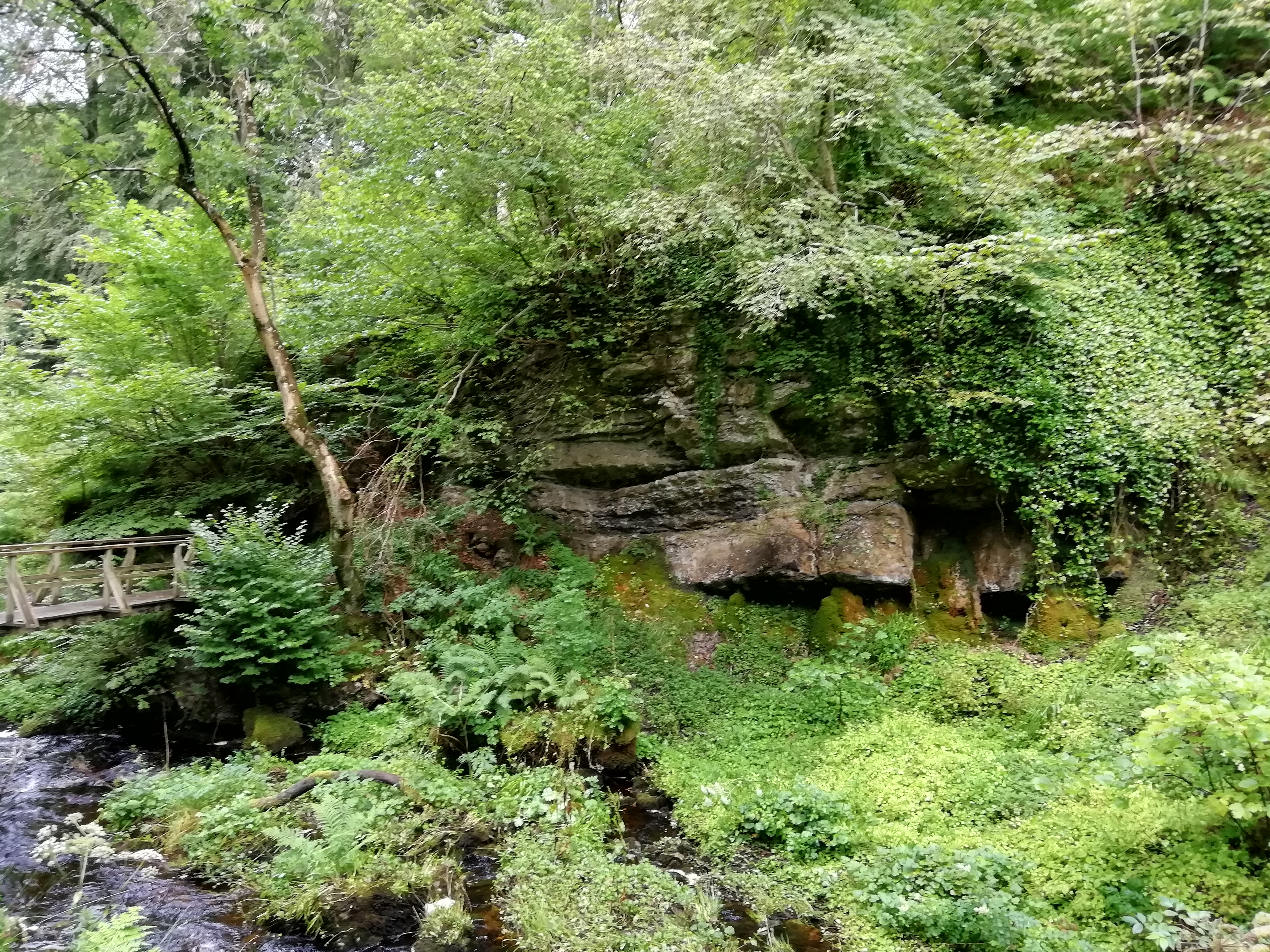 Photo 8 The footbridge at Craigy Bield with overgrown sandstone crags.