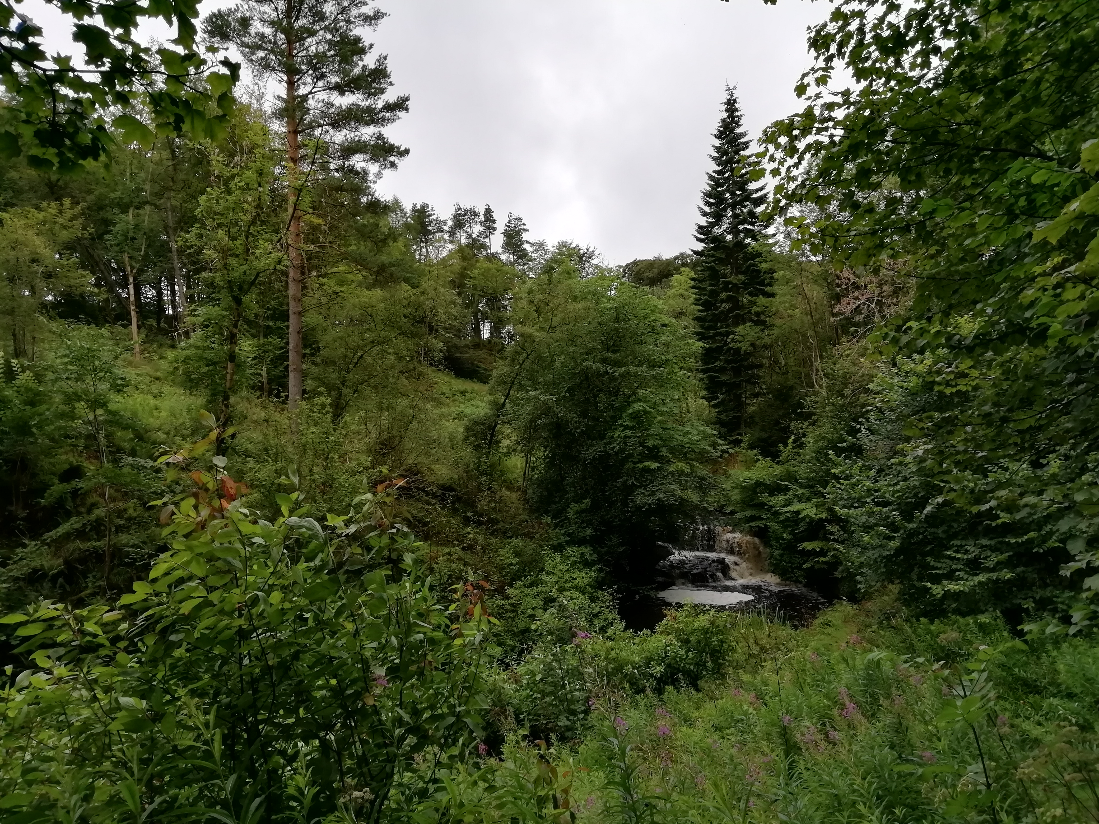 The River North Esk flows through a steep-sided and narrow valley about a kilometre long between Mill Bridge near Amazondean and Craigy Bield. The valley is thought to be a glacial meltwater channel and the waterfall is a knick point, produced by headward erosion by the river.