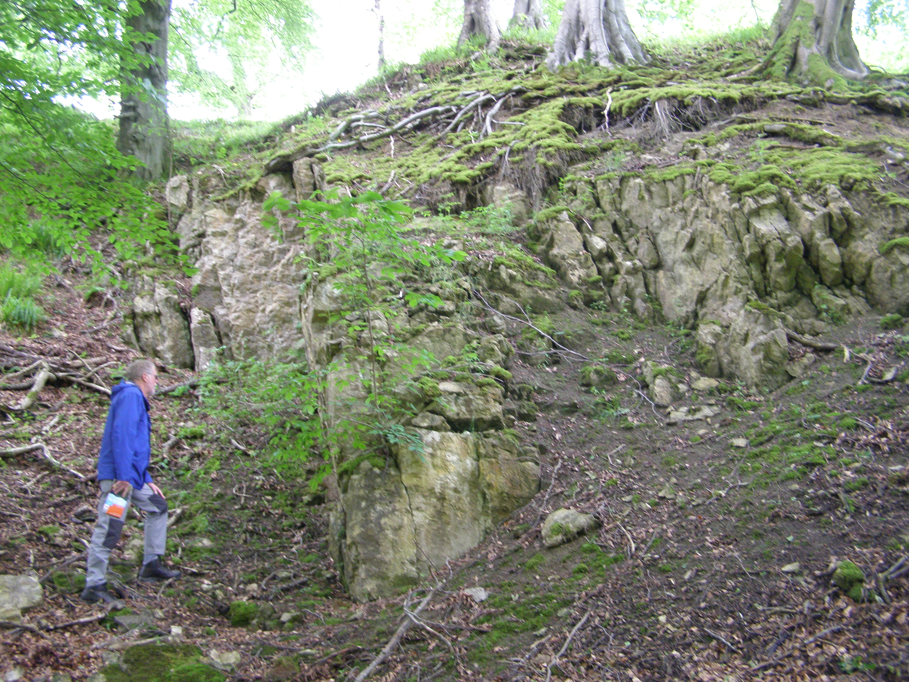1. Limestone exposure at NT 1690 5640 near Mill Bridge, Amazondean. This is the Blackhall Limestone within the Lower Limestone Formation and is a crystalline, fossiliferous, cream-coloured limestone that effervesces freely with dilute HCl and has a characteristic yellow weathering skin. Fragments of crinoid stems, a solitary coral and shells were visible in a loose block. Rubbly beds of limestone range in thickness from 10 cm to more than 1 m and the dip is 83 towards the south-east. The steep dip suggests the proximity of a fault (Photos 1 & 2).