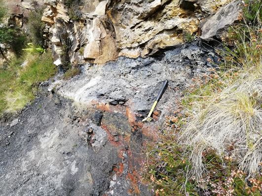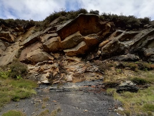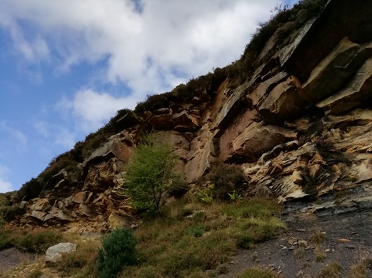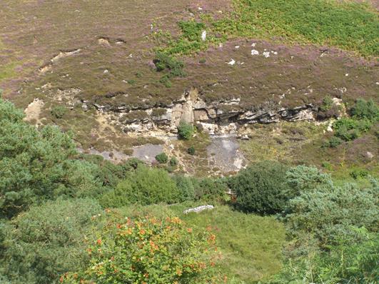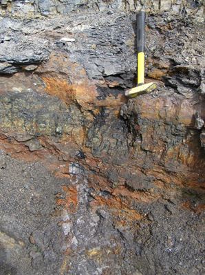 A steep rock face which exposes sandstones, siltstones and coal seams of the Lower Carboniferous Limestone Coal Formation, Clackmannan Group (Namurian) can be found close to the River North Esk in the gorge downstream from the settlement of Marfield. The exposure is about 10 m high in total with yellow and white sandstones forming the upper half of the cliff. Below the sandstones is a sequence of siltstones with two coal seams, both less than 30 cm thick. Between and beneath the two coal seams are laminated black siltstones, probably rich in organic material as they include shiny carbon films on some surfaces. About 20 cm below the lower coal seam is a bed of pale grey clay which may represent a seat earth, a deposit often associated with coal seams. All these rocks are heavily impregnated with iron which gives them an orange-brown colour and the lower coal seam also has yellow colouration resulting from a high sulphur content. Iron nodules were seen on the scree slopes and have probably fallen from the siltstones above.