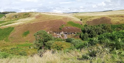View of the river cliff exposure from Marfield at NT 18970 56914 looking north-east over Auchencorth Moss. The exposures on the left, on the edge of the plateau, are part of the Upper Limestone Formation, while, in the distance, Auchencorth Moss is underlain by the sandstones of the Passage Formation. The river cliff shown on the steep side of the valley just above the trees and lying below the Upper Limestone Formation, is therefore part of the Limestone Coal Formation.